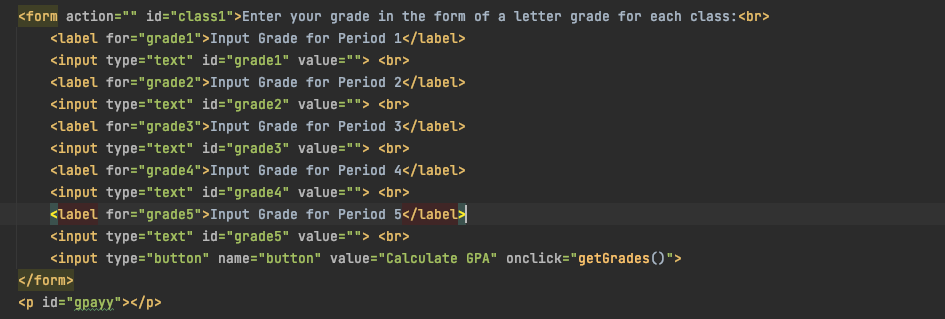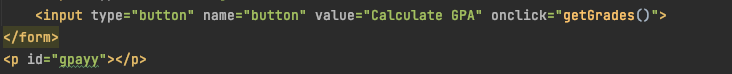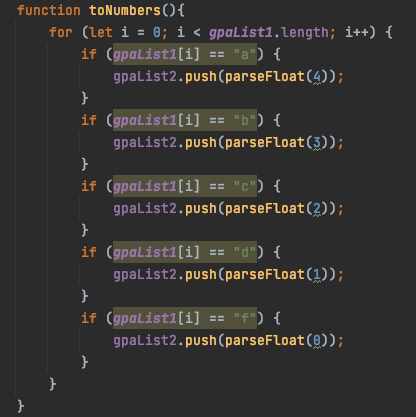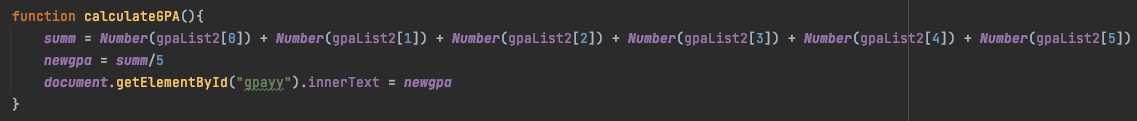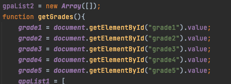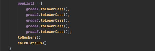 These two code segments are both lists that help to run the program. Each list stores the values that were inputted by the user but they are in different forms. The two lists work with each other to store the inputs. The second list takes the data provided by the input then changes the values to lowercase so that the data is coherent. The first list changes the input into a new variable. The two lists are gpaList2 and gpaList1. These lists contain data of the inputs given by the user. So the grade the user got in each class is stored in the list. This allows for the program to calculate the GPA. Without the lists the program’s code would be a lot more lines. Lists also help so there aren’t individual variables to work with. If I didn’t have this list I would have to add in more statements showing the lowercase letters and what they would equal. That would cause the program to go throught more steps going through each if statements. Another thing I would probably have to do for the code is make a function for each input. This would cause the code to be over 300 lines of code because I would have to put in a function with ten if statements. For the uppercase and lowercase letter grades. Theses lists allow for the code to be less complex. It creates a more organized way of storing the values.