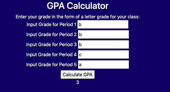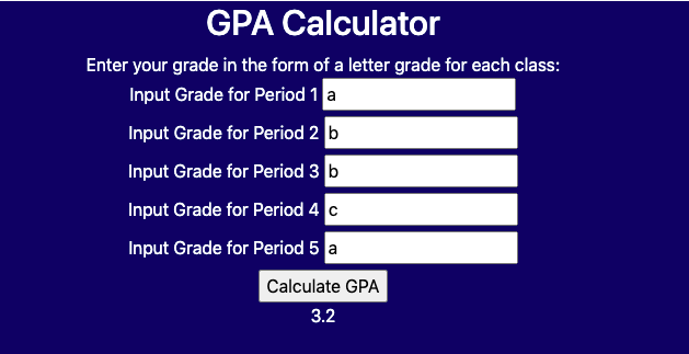 a) The overall purpose of the program is for students to be able to calculate their GPA for the trimester. It allows students to be able to see how their grade reflects on their GPA. GPA is the grade point average of a student’s grades they get. Making a easy way for students to find theres will help them in the future. The video, it shows a user inputting their grades. I had them all lower case but the function would still work if some were uppercase. After typing in a letter grade the function takes it in then releases an output. That output, as seen, is the GPA of the five classes. The inputs provided in the video is A, B, and C. Other inputs include D and F but it is not shown in the video. The output in the video was the GPA of the five grades imputed, 3.2. The output can be anywhere between zero and four.